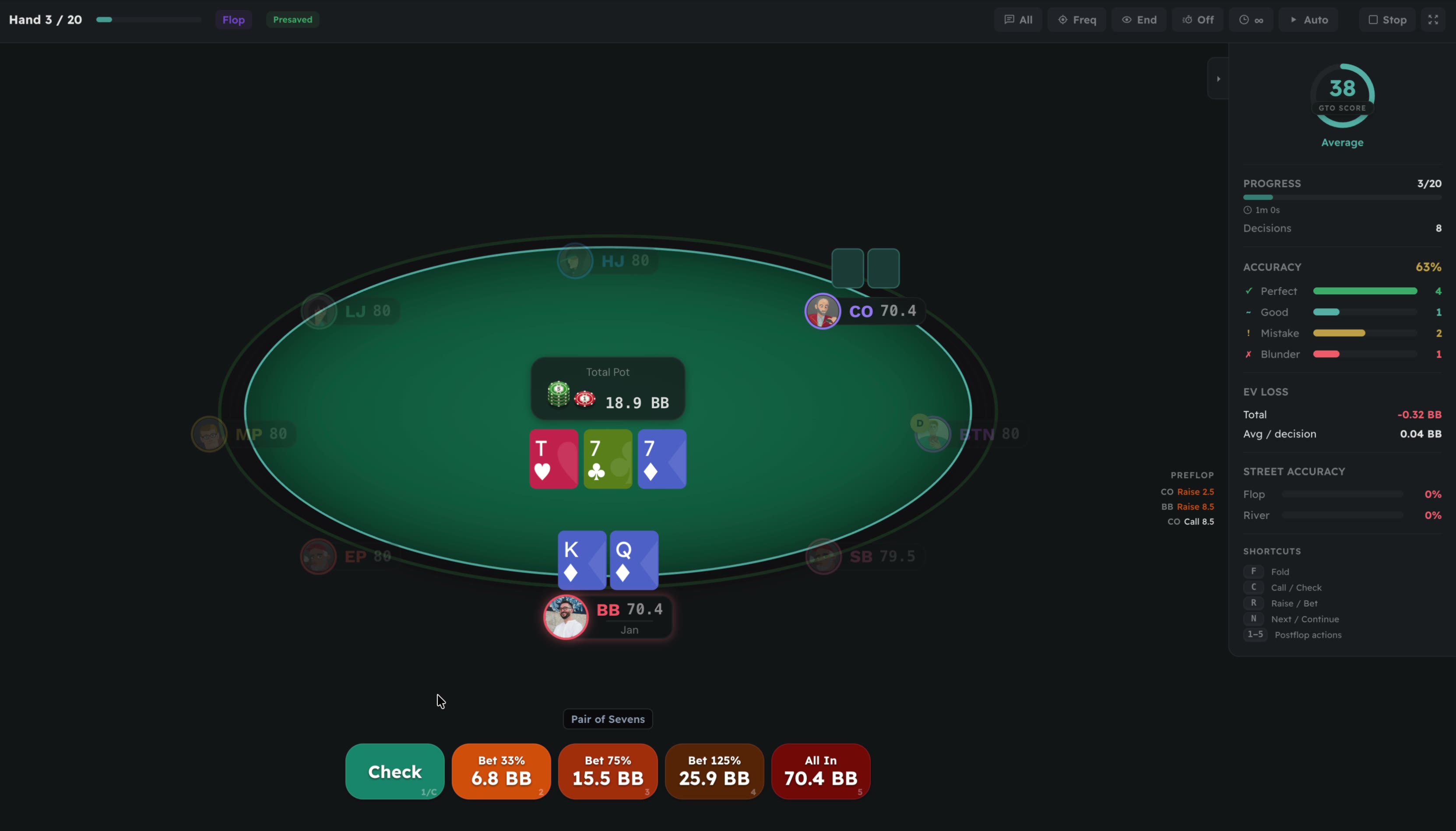See how instant GTO feedback after every decision turns guessing into certainty — one hand, preflop to river.