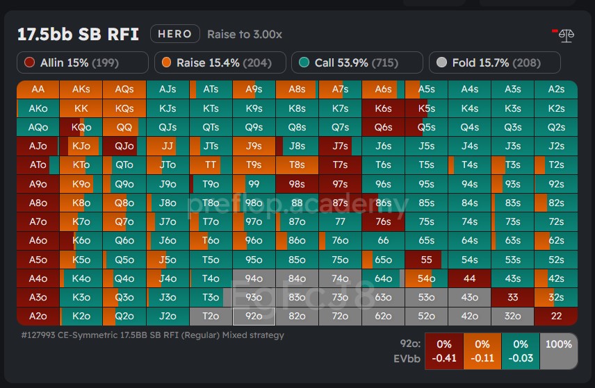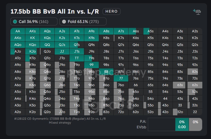 When analyzing the hands, the BB player chooses to raise, we observe that they predominantly consist of offsuit hands. In most cases, the solver suggests a mixed strategy, where the expected value (EV) of both raising and checking options is the same.