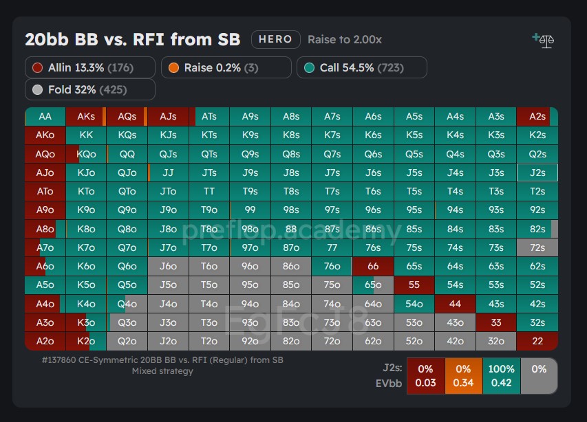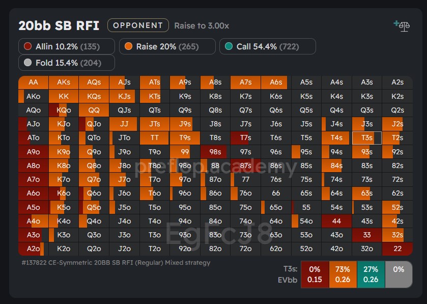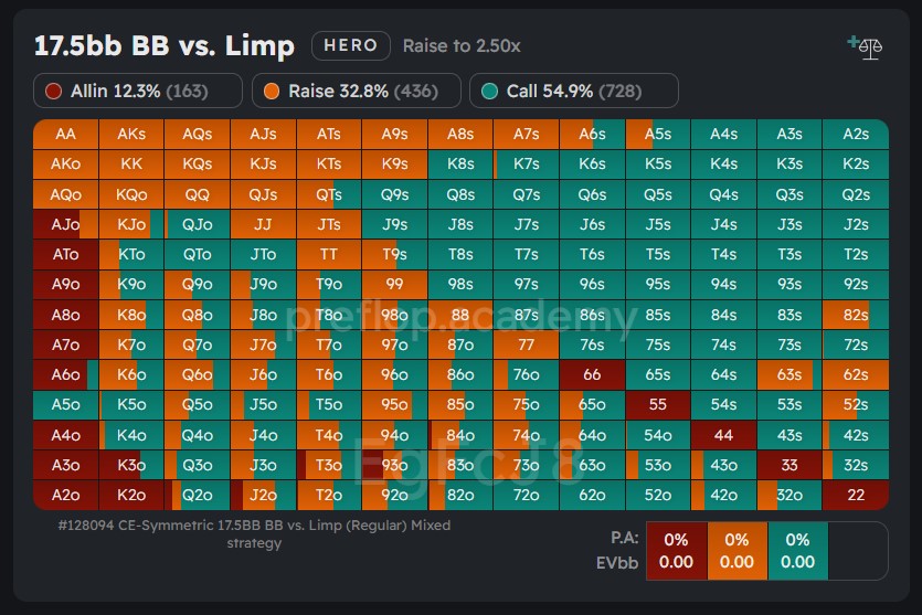 An optimally playing opponent in the small blind (SB) tends to limp around 54% of their range. This indicates that a significant portion of their range will fold to a raise. Consequently, the player in the big blind (BB) is motivated to construct their raising range in a way that achieves some pre-flop folds while also avoiding regret if they have to fold to an all-in jam.