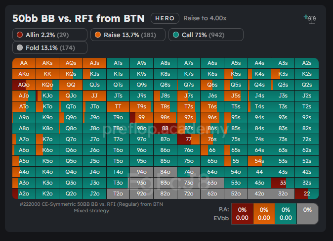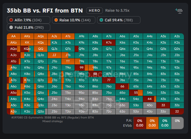 It’s noteworthy that hands like A5o or A2o at 35bb can also be effectively played through an all-in open with BTN. These types of hands perform well in this situation, as they block the opponent’s strong hands.