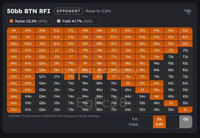 He suggests reviewing your hand history to determine the frequency of your 3-bet in this situation. After gaining this insight, it would be beneficial to utilize the training module at Poker Academy. Here, you can rehearse this particular scenario, honing your skills until they are flawless.