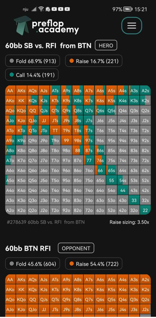 Our goal is to make your experience with Preflop Academy as smooth as it can be. Just like in the web version, we not only present the specific chart you’re searching for but also provide related charts. Consider a situation where you’re examining the 3-betting range against a player on the BTN while seated at the SB. On the same screen, you’ll discover not only a comprehensive strategy tailored to that scenario but also a related strategies, in this case Villain’s RFI strategy.