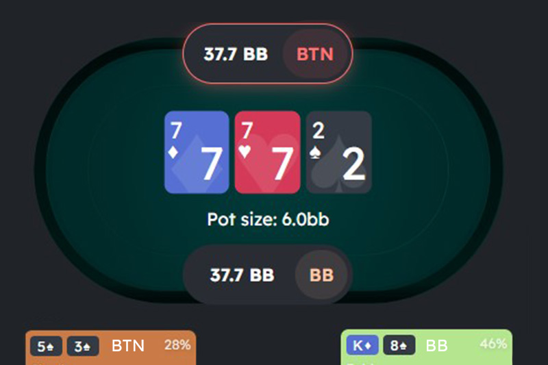 We defended the Big Blind (BB) with K8o. The flop came out as 772. After our check, the opponent played a continuation bet (C-bet). Despite our hand having a substantial equity of 46%, we were compelled to fold. If the opponent bet with 53s, they did so with an equity of just 28% and we folded a way better hand. Understanding our opponent’s range could have helped us make a more informed decision.