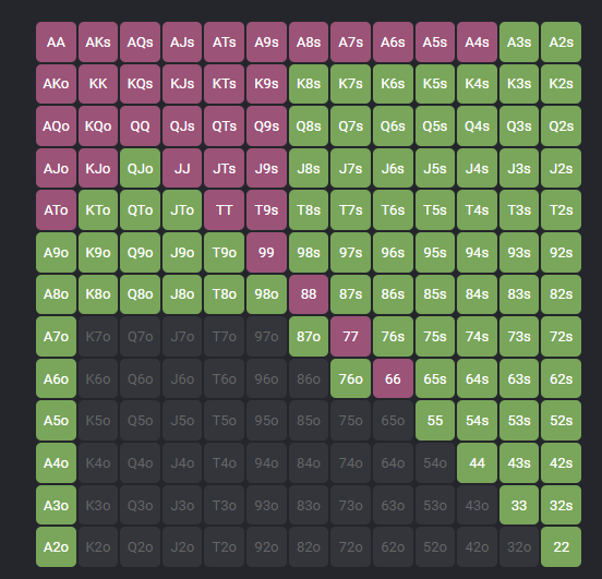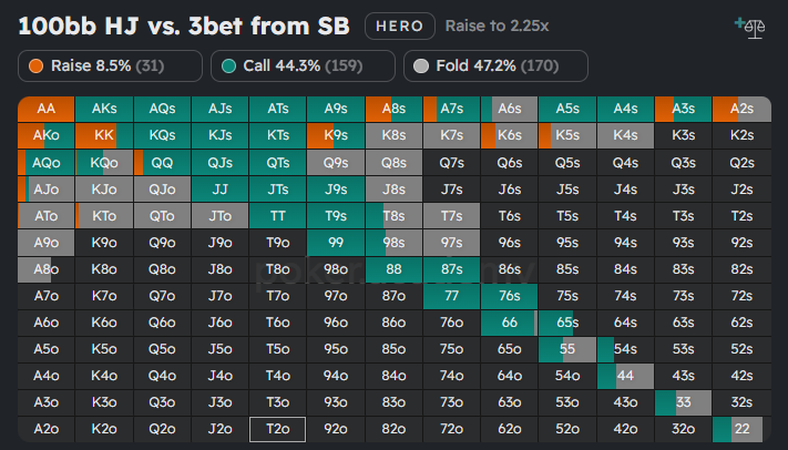 This is the chart for ‘normal’ players on Hijack against your 3-bet from Small Blind. Now, compare this example from Poker Academy’s Preflop Charts tool to maniacal HJ strategy, which you can see below.
