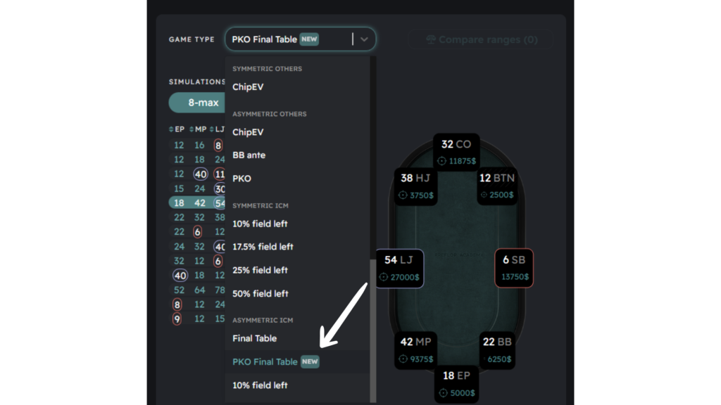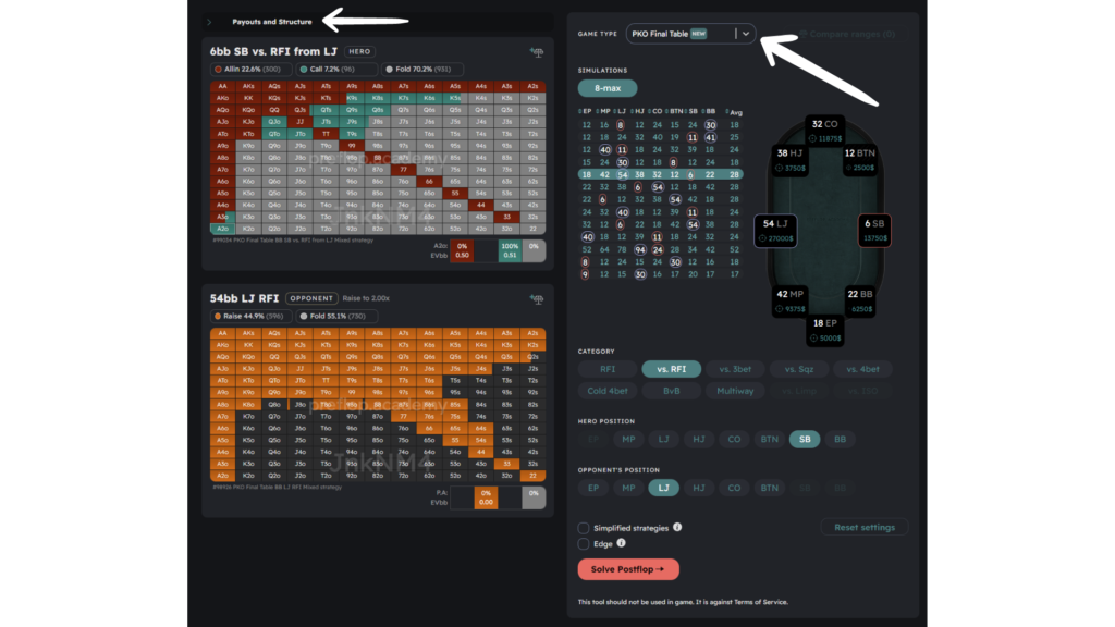To access the solutions, simply navigate to the Tournaments tab and locate the PKO Final Table. From there, select your preferred scenario and delve into the ranges. Keep in mind that ranges interact with one another, so take a closer look to understand the reasons behind certain actions. If you have any questions, feel free to reach out in Discord.