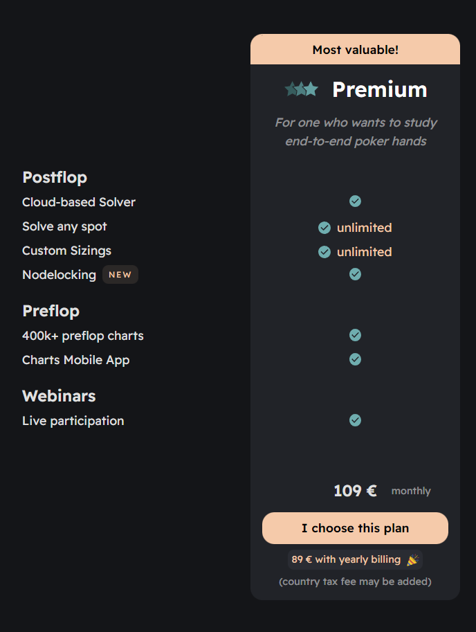If you want to get access to our solutions I advise you to go with our best plan where you will be able to use the preflop ranges in the postflop solver as well, unlimited!