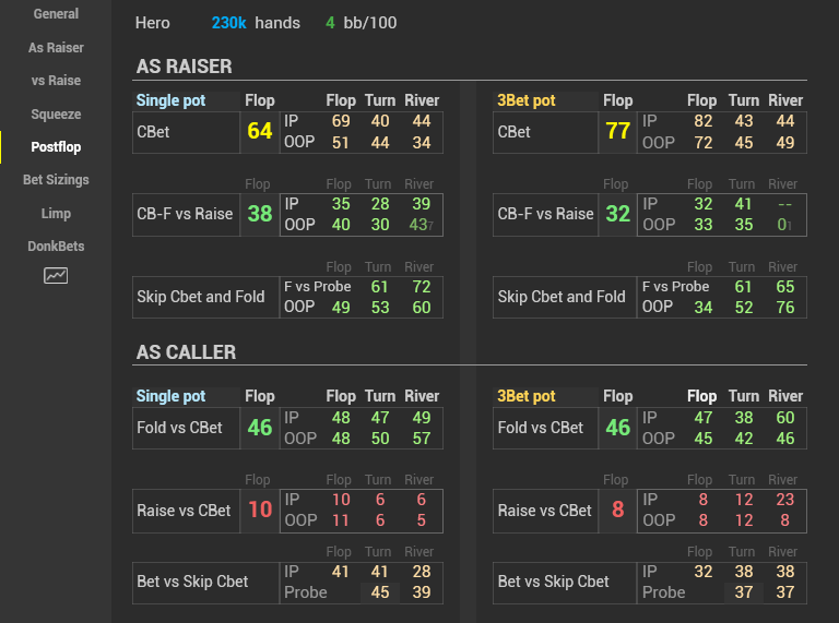 There are other important preflop stats, including 3bet% and Fold to 3bet%, which refer to the percentage of hands your opponent reraised preflop or folded when facing a 3Bet. If an opponent has 3bet% lower than 5%, usually it means it’s a nit and you should over fold your range, no shame having fold-to-3bet stat around 80-90% in this case.