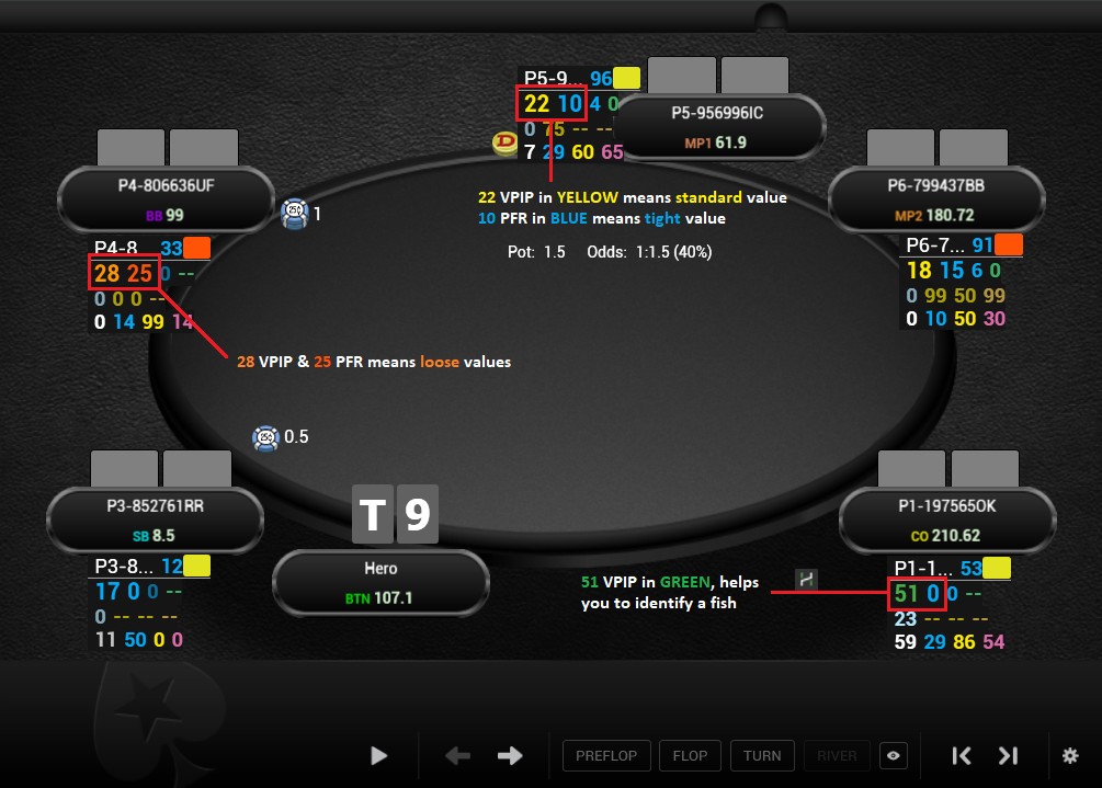VPIP (Voluntary Put Money Into Pot) is the most important and fundamental statistic you should have. It tells you what percentage of hands a player has been involved in. A 15-20% VPIP in full ring tournaments is average. If someone has a VPIP of 35% or more, you can instantly assume they are very loose.