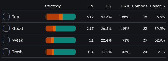 Understanding Strategy: By breaking down the range of possible hands into top, good, weak, or trash based on equity, the tool helps you understand which part of the range you are in.