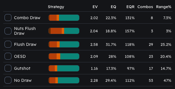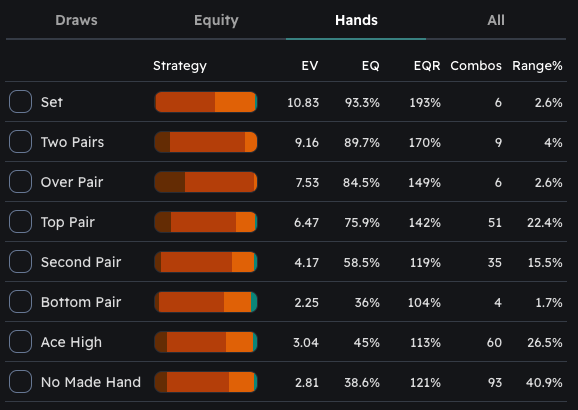 Strategic Stats: Detailed equity (EQ) and expected value (EV) stats for every hand, from Straight Flush π to No Made Hand π.